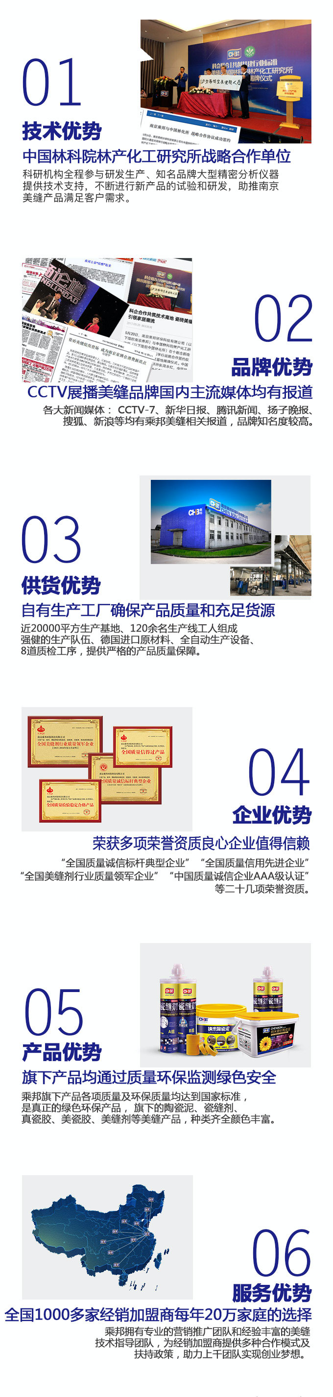 南京乘邦環(huán)保科技有限公司成立于2005年,是集南京瓷磚美縫南京美縫施工、高科技產(chǎn)品的研發(fā)與銷&售等產(chǎn)業(yè)的南京瓷磚美縫公司。目前公司主打美縫產(chǎn)品為國(guó)內(nèi)推出的傳統(tǒng)美縫劑升級(jí)產(chǎn)品:乘邦納米陶瓷泥、水性環(huán)氧彩砂,天然砂質(zhì)顏料,化妝品般安全無(wú)污染。乘邦陶瓷泥顏色豐富,大大提升裝飾效果,打造魔幻家居,讓家也可以炫酷起來(lái)。它綠色環(huán)保防霉防污,堅(jiān)硬如瓷細(xì)膩光潔,不僅做到瓷磚縫隙“不變黑”,而且在為每一個(gè)家庭健康美麗而努力,這是乘邦公司的最高準(zhǔn)則,也是乘邦人為之努力奮斗的目標(biāo),以此目標(biāo)乘邦本著"誠(chéng)信、合作、專業(yè)、超越"的理念,詮釋優(yōu)質(zhì)服務(wù),演繹品質(zhì)生活。同時(shí)公司擁有一支管理完善、經(jīng)驗(yàn)豐富的專業(yè)美縫施工隊(duì)伍。在南京瓷磚美縫價(jià)格方面也有很大的優(yōu)勢(shì),每年為南京近萬(wàn)家庭提供美縫服務(wù),其自主研發(fā)的乘邦牌產(chǎn)品在10余省市已有近千個(gè)代理商,在全國(guó)范圍內(nèi)享有很高的知名度。